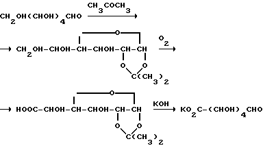Глюкарат калия синтезировали из глюкозы по схеме:![]() В фарфоровой чашке емкостью 0,5 л смешивали 54 г D-глюкозы с 320 мл 25%-ной азотной кислоты (d=1,15). Раствор нагревали на кипящей водяной бане при непрерывном перемешивании стеклянной палочкой. Реакционную смесь нагревали под тягой до прекращения выделения окислов азота, после чего раствор упаривали до образования сиропа, окрашенного в желтовато-коричневый цвет. Полученную сиропообразную массу растворяли в небольшом количестве воды (10 мл) и, продолжая нагревание на водяной бане, постепенно нейтрализовали растертым углекислым калием до щелочной реакции на лакмус. При этом образовывались хорошо растворимая в воде средняя калиевая соль сахарной кислоты, которую переводили в кислую соль путем обработки уксусной кислотой. Для этого к охлажденному раствору при помешивании добавляли по каплям ледяную уксусную кислоту до тех пор, пока проба хорошо перемешанного раствора не приобретала запаха уксусной кислоты. Полученную смесь оставляли стоять при комнатной температуре в течение 36-48 ч, после чего выпавшие кристаллы монокалиевой соли сахарной кислоты отфильтровывали на воронке Бюхнера и промывали несколькими миллилитрами ледяной воды. Полученный осадок, окрашенный в светло-коричневый цвет, растворяли в небольшом количестве горячей воды (35-40 мл), кипятили в течение 5 мин с 0,5 г активированного угля, фильтровали и фильтрат охлаждали. При охлаждении из фильтрата выпадала малорастворимая в воде чистая монокалиевая соль сахарной кислоты (глюкарат калия), которую отфильтровывали, промывали спиртом и высушивали. Выход составлял 20-22 г. Определение подлинности проводили по реакции на остаток сахарной кислоты и калий. В пробирку размером 22х3 см с отшлифованной пробкой помещали 1-3 мг вещества, растворяли в 5 мл воды. Раствор окисляли 0,25 М йодатом натрия (NaIO4). Смесь нагревали 30 мин при 100oC, охлаждали и добавляли 0,2 мл этиленгликоля. Полученный раствор титровали 0,01 Н гидроокисью натрия (NaOH). Индикатор – метиловый красный. В этих же условиях проводили холостой опыт (без соли сахарной кислоты). Молекула сахарной кислоты при окислении образовывали 6 молекул муравьиной кислоты. Раствор вещества (1:50) давал характерную реакцию на калий (ГФХ, С. 744). Чистота синтезированного глюкарата калия составляла более 99%. Формула C6H9O8K. Мм 248,24. Точка плавления 188oC (разложение). Пример 2. Химический синтез глюкуроната калия. Глюкуронат калия синтезировали из глюкозы по схеме: ![]() На первой стадии D-глюкозу превращали в 1,2-O-изопропилиден- -D-глюкофуранозу, которую окисляли в 1,2-O-изопропилиден- -D-глюкуроновую кислоту. После снятия изопропилиденовой защиты получали -D-гюкуроновую кислоту, которую выделяли в виде D-глюкофурануроно-6,3-лактона. Обработкой последнего гидроокисью калия получали калиевую соль глюкуроновой кислоты (глюкуронат калия).