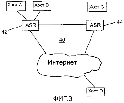 Фиг.3 схематически иллюстрирует широкополосную сеть 40 в соответствии с настоящим изобретением, имеющую два маршрутизатора 42, 44 ASR. Хост A и Хост B соединены с маршрутизатором 42, а Хост C соединен с маршрутизатором 44. Оба маршрутизатора 42 и 44 имеют прямое соединение между собой, причем маршрутизатор 42 содержит фильтр по настоящему изобретению. Фиг.3 также изображает Хост D, соединенный с широкополосной сетью через Интернет.