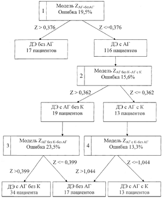 Х5 – характер сопутствующей патологии, Х9 – вид и количество нарушений мозгового кровообращения, X12 – локализация очагов, Х17 – уровень расположения односторонних полушарных очагов, X18 – уровень расположения двусторонних полушарных очагов, X41 – дефекты полей зрения, Х44 – степень выраженности нервно-психических расстройств; значения показателей состояния больных идентифицируют по “карте обследования больных с энцефалопатией” и при значении ZАГбезК-безАГ 0.399 диагностируют дисциркуляторную энцефалопатию без артериальной гипертензии, при ZАГбезК-безАГ 0,399 – дисциркуляторную энцефалопатию с артериальной гипертензией без кризов, а при значении ZАГбезК-АГсК>1.044 диагностируют дисциркуляторную энцефалопатию без артериальной гипертензии, при ZАГбезК-АГсК 1.044 дисциркуляторную энцефалопатию с кризовым течением артериальной гипертензии.