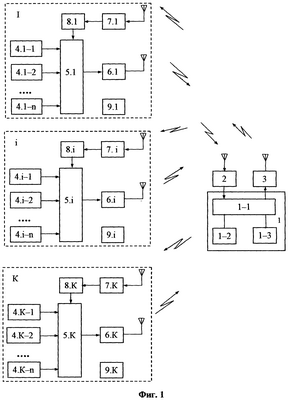 В состав регистраторов I, II, i. К, располагаемых на пациентах, входят датчики (4.i-1)÷(4.i-n) физиологических параметров i-го пациента (n -общее число, количество датчиков, устанавливаемых на i-ом пациенте), блок 5.i преобразования информации, передатчик 6.i электромагнитного сигнала, установленный на i-ом пациенте, приемник 7.i электромагнитного сигнала i-го пациента, блок 8.i управления i-го пациента, автономный источник 9.i питания всей аппаратуры, установленной на на i-ом пациенте, например аккумуляторная батарея.