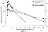 На фиг.11 в полулогарифмическом масштабе показано влияние лекарственной композиции на достигаемый in vivo уровень ее содержания в плазме у человека после введения 100 мг гидросульфата пиперазиномочевины в виде традиционного перорального препарата, а также после приема препаратов, указанных в примерах 1 (таблетка с матрицей С) и 2 (таблетка с матрицей Е).