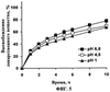 На фиг.7 показана зависимость высвобождения гидросульфата пиперазиномочевины (33% гидросульфата пиперазиномочевины, 25% Kollidon SR®, 16% фумаровой кислоты и 10% микрокристаллической целлюлозы в пересчете на общую массу таблетки) от значения рН.