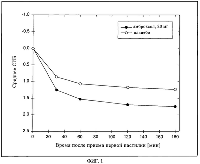 На фиг.1 показан график, отражающий среднее изменение во времени интенсивности боли (снижение интенсивности боли (СИБ)) с момента, предшествующего приему лекарственного препарата (базовая линия), до момента по истечении 3-х часов после приема первой пастилки, содержащей 20 мг амброксола гидрохлорида, и плацебо.
