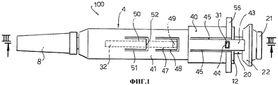В боковой стенке части 41 меньшего диаметра гильзы образованы две центральные лапки 47. Центральные лапки 47 являются продольно ориентированными, расположенными диаметрально противоположно одна относительно другой и упругими. Каждая центральная лапка 47 образована, по существу, U-образной прорезью 48, проделанной так, чтобы лапка могла радиально отгибаться наружу.