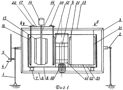 Планетарный смеситель содержит стойки 1, на которых с возможностью поворота вокруг горизонтальной оси 2 установлена прямоугольная каркасная рама 3. Каркасная рама 3 поворачивается посредством штурвала 4, который снабжен фиксатором 5 с целью исключения произвольного поворота. На нижней перекладине 6 прямоугольной каркасной рамы 3 посредством опор качения 7 установлена емкость 8, приводимая во вращение приводом 9, содержащим электродвигатель 10 и подшипниковый узел 11 привода 9, расположенный в цилиндре 12. На верхней перекладине 13 прямоугольной каркасной рамы 3 закреплен привод 14 перемешивающего рабочего органа-активатора 15, который установлен с возможностью изменения первоначальной установки активатора под разными углами в вертикальной плоскости и расположен внутри емкости 8 между стенками емкости 8 и цилиндром 12. Привод 14 активатора выполнен с возможностью изменения направления вращения активатора, т.е. снабжен реверсом, вследствие чего активатор может вращаться как в одном направлении с емкостью 8, так и навстречу вращения емкости 8. На оси 16 активатора 15 установлено водило 17, на концах которого в пазах 19 дополнительно закреплены с возможностью вращения вокруг своей вертикальной оси отборные лопатки 18. Пазы 19 дают возможность регулировать положение отборных лопаток. Лопатки располагают между стенками емкости 8 и активатором 15, при этом положение отборных лопаток регулируется относительно положения активатора 15 благодаря наличию пазов, т.е. лопатки могут быть расположены как в одной вертикальной плоскости с активатором (положение I), так и в разных (положение II) в зависимости от свойств перемешиваемых компонентов. Отборные лопатки 18 имеют самостоятельный привод 20 вращения их вокруг своей вертикальной оси, таким образом, они могут вращаться как с водилом 17, так и без него. При вращении водила 17 отборные лопатки 18 интенсифицируют процесс перемешивания, одновременно очищают стенки емкости 8 и цилиндра 12 от налипшей массы и подают ее на активатор 15. При перемешивании более жидких растворов водило не вращается, а отборные лопатки 18, вращаясь только вокруг своей оси, также интенсифицируют процесс перемешивания. При выгрузке готовой массы отборные лопатки 18 очищают стенки емкости 8 от налипшей массы, тем самым обеспечивают более полную выгрузку готового продукта. Отборные лопатки 18 могут быть выполнены как жесткими, так и эластичными. На верхней перекладине 13 каркасной прямоугольной рамы установлены периферические скрепки 21, опущенные в емкость 8, но расположены вне зоны вращения водила 17 с отборными лопатками 18, и один из них взаимодействуют с внутренней стенкой емкости 8, а другой с наружной стенкой цилиндра 12. Периферические скрепки 21 выполнены по длине, соразмерной с глубиной емкости 8, и соединены перекладиной 22, снабженной пальцами 23, так что скрепки очищают стенки емкости, а пальцы дно емкости, и подают счищенную массу под воздействие активатора. Периферические скрепки 21 могут быть расположены в любом месте в емкости 8.