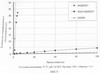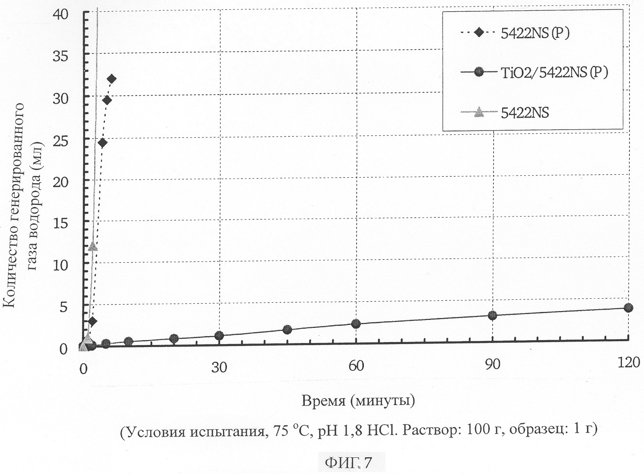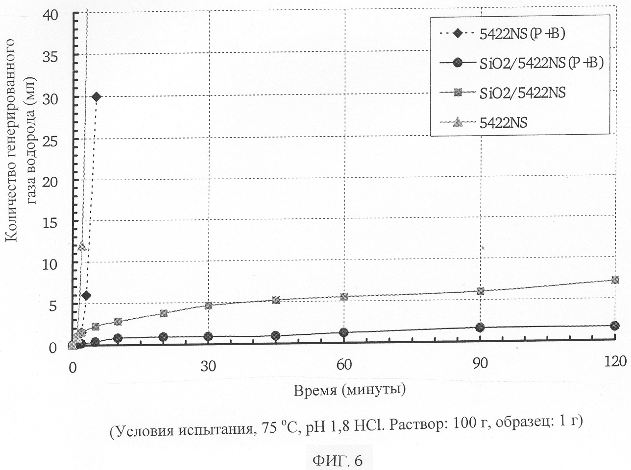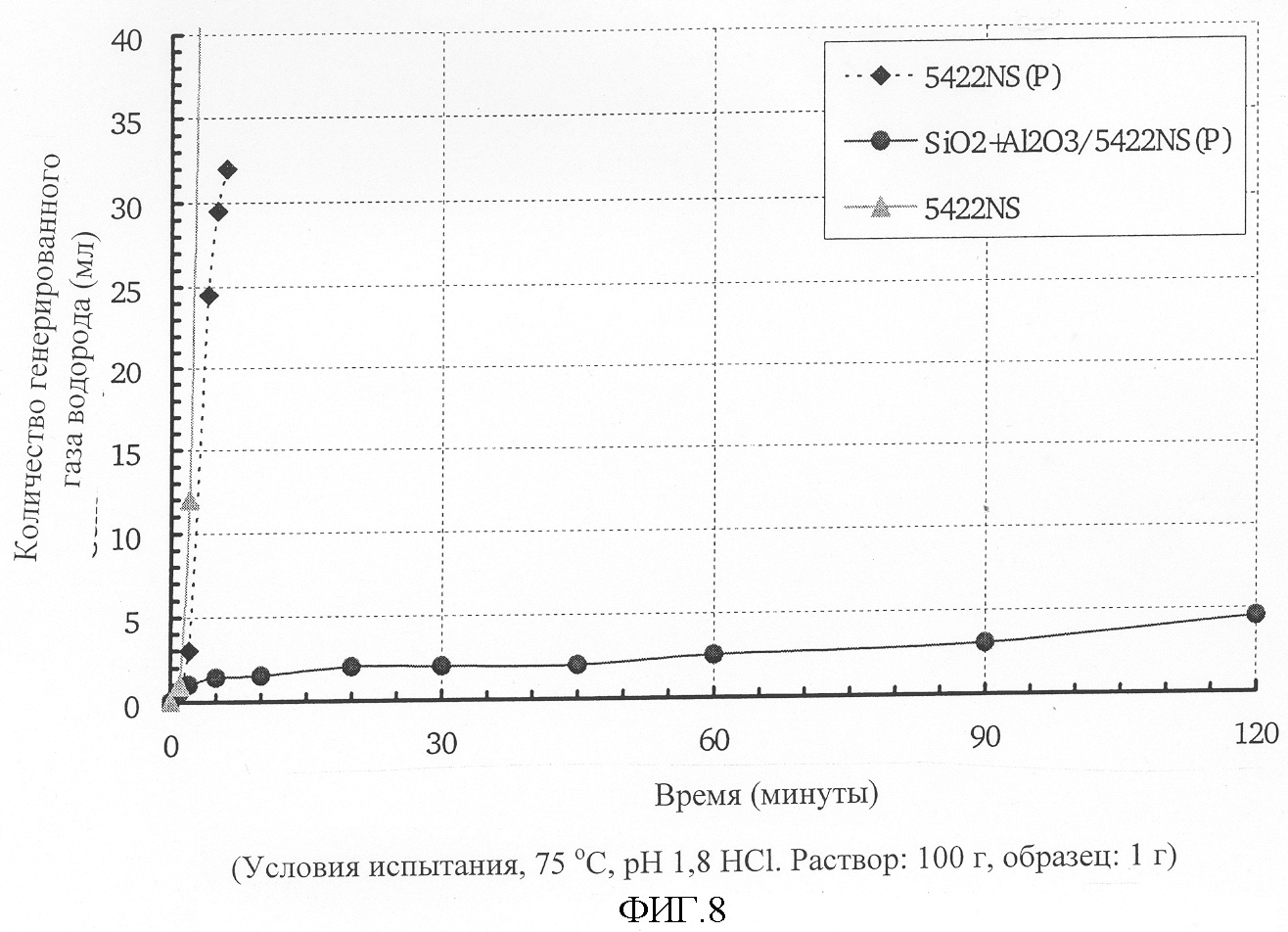 – Угол оттенка представляет собой tg-1(b*/a*). Из результата таблицы, когда максимальная цветность при 45/40 и угле оттенка 109° (зеленовато-желтый) была 26,39, даже когда угол наблюдения был изменен, изменение в угле оттенка было минимальное (от 104° до 111° (зеленовато-желтый)), в соответствии с чем никакого эффекта цветового перехода не наблюдали. Испытание на антикоррозионность (измерение количества генерированного газа водорода): По 1 г каждого образца диспергируют в 100 г теплой воды (75°С), рН доводят до 1,8 с помощью соляной кислоты (HCl) и температуру этой суспензии поддерживали при 75°С при перемешивании. После заданного времени измерили количество выделенного из суспензии водорода (Н2). Измерения были взяты в течение 120 минут. Сравнение между необработанными чешуйками Al (агент поверхностной обработки удалили путем промывания), чешуйками Al (Р) {обработанными только соединениями фосфорной кислоты (первая стадия – обработка)} и SiO2/Al чешуйками (Р) {покрытыми гидратированным кремний оксидом, после обработки соединениями фосфорной кислоты (первая стадия – обработка + вторая стадия – покрытие)} показано на Фиг.3, 1-4. Подобное сравнение между Al-чешуйками, обработанными соединениями борной кислоты (Пример 5) вместо соединений фосфорной кислоты показано на Фиг.5. Точно также подобное сравнение между Al-чешуйками, обработанными соединениями фосфорной кислоты и соединениями борной кислоты (Пример 7) вместо соединений фосфорной кислоты показано на Фиг.6. Сравнение между необработанными чешуйками Al (агент поверхностной обработки удалили путем промывания), чешуйками Al (Р) {обработанными только соединениями фосфорной кислоты (первая стадия – обработка)} и TiO2/Al чешуйками (Р) {покрытыми гидратированным титан оксидом, после обработки соединениями фосфорной кислоты (первая стадия – обработка + вторая стадия – покрытие)} показано на Фиг.7. А сравнение между необработанными чешуйками Al (агент поверхностной обработки удалили путем промывания), чешуйками Al (Р) {обработанными только соединениями фосфорной кислоты (первая стадия – обработка)} и SiO2/+Al2O3/Al чешуйками (Р) {покрытыми гидратированным кремний оксидом и алюминий оксидом, после обработки соединениями фосфорной кислоты (первая стадия – обработка + вторая стадия – покрытие)} показано на Фиг.8. Фиг.1 показывает сравнение количества генерированного газа водорода в случае использования SS5588 среди необработанного SS5588, SS5588(P) и SiO2/SS5588(P). Здесь, SS5588(P) был получен в 1-а) Примера 1, и SiO2/SS5588(P) был получен в Примере 1-b) Примера 1. Количество генерированного газа водорода было очень малым для SiO2/SS5588(P) в соответствии с настоящим изобретением. Фиг.2 показывает сравнение количества генерированного газа водорода в случае использования 550N среди необработанного 550N, 550N(P) и SiO2/550N(P). Здесь, 550N(Р) был получен в 2-а) Примера 2, и SiO2/550N(P) был получен в 2-b) Примера 2. Газ водород не генерировался с SiO2/550N(P) в соответствии с настоящим изобретением. Фиг.3 показывает сравнение количества генерированного газа водорода в случае использования SL800 среди необработанного SL800, SL800(P) и SiO2/SL800(P). Здесь, SL800(P) был получен в 3-а) Примера 3, и SiO2/SL800(P) был получен в 3-b) Примера 3. Газ водород редко генерировался с SiO2/SL800 (P) в соответствии с настоящим изобретением. Фиг.4 показывает сравнение количества генерированного газа водорода в случае использования 5422NS среди необработ