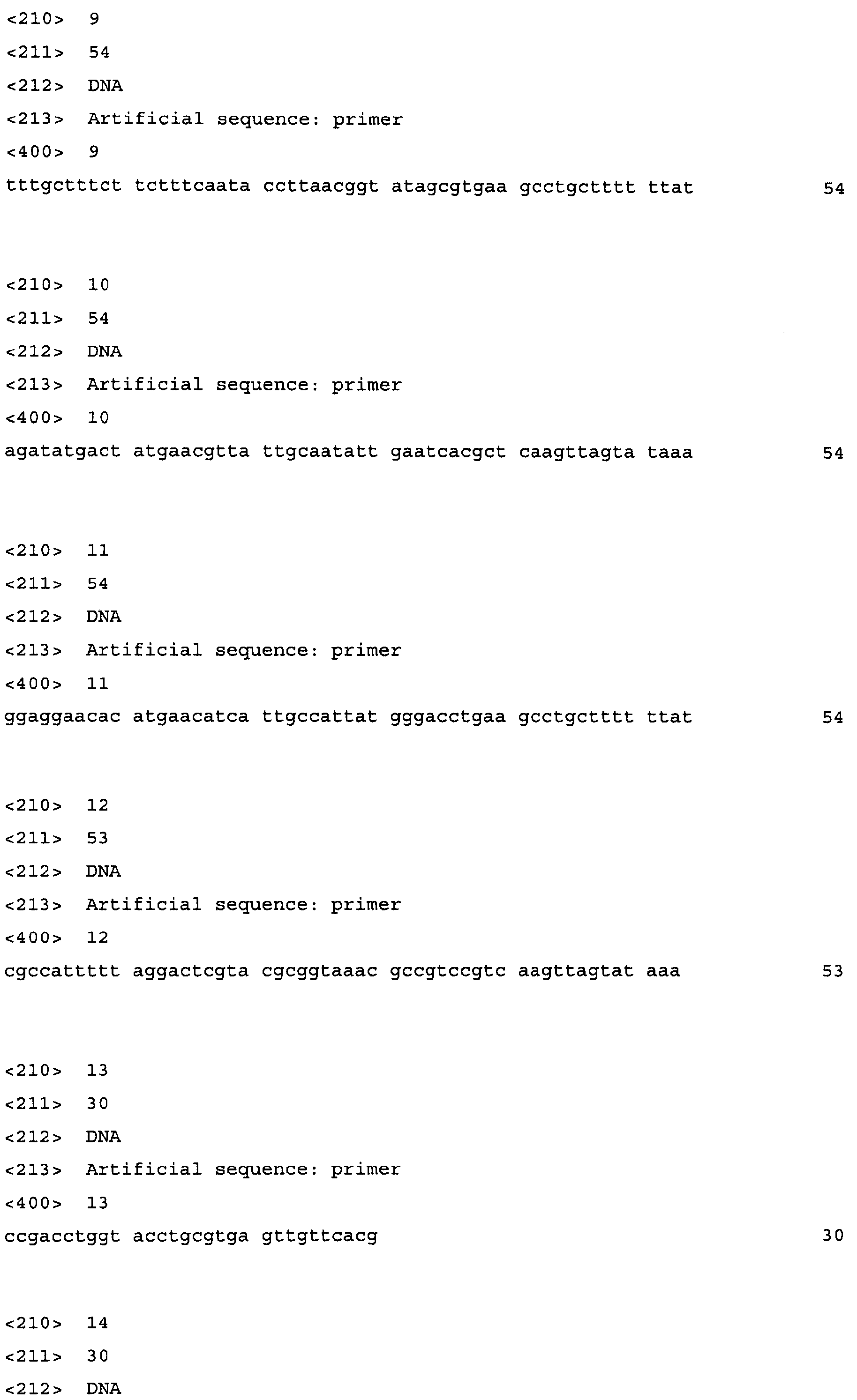 0.4-0.7. Выросшие клетки из 10 мл бактериальной культуры отмывают 3 раза ледяной деионизированной водой, затем ресуспендируют в 100 мкл воды. 10 мкл фрагмента ДНК (100 нг), растворенной в деионизированной воде, добавляют к клеточной суспензии. Электропорация может быть осуществлена на электропораторе “Bio-Rad” (США) (№165-2098, версия 2-89) в соответствии с инструкциями производителя. Электропорированные клетки добавляют к 1-мл среды SOC (Sambrook et al., “Molecular Cloning A Laboratory Manual, Second Edition”, Cold Spring Harbor Laboratory Press (1989)), инкубироваться в течение 2 часов при 37°С и затем высеваться на L-агар, содержащий 25 мкг/мл хлорамфеникола. Колонии, выросшие в течение 24 часов, могут быть проверены на присутствие маркера CmR вместо природной промоторной области гена araE с помощью ПЦР с использованием праймеров Р4 (SEQ ID NO:7) и Р5 (SEQ ID NO:8). Для этой цели свежеизолированные колонии могут быть ресуспендированы в 20 мкл воды, после чего 1 мкл полученной суспензии может быть использован для ПЦР. Может быть использован следующий температурный профиль:начальная денатурация ДНК в течение 10 минут при 95°С; затем 30 циклов денатурации при 95°С в течение 30 сек, отжиг при 55°С в течение 30 сек и полимеризация при 72°С в течение 1 мин и финальная полимеризация в течение 7 минут при 72°С. CmR колонии должны содержать фрагмент ДНК1400 п.о., подтверждающий наличие CmR маркера ДНК вместо природной промоторной области в 45 п.о. гена araE (смотри Фиг.1). Один из этих штаммов может быть излечен от термочувствительной плазмиды pKD46 выращиванием при 37°С и полученный штамм может быть назван Е.coli М01655РL-tacaraE.