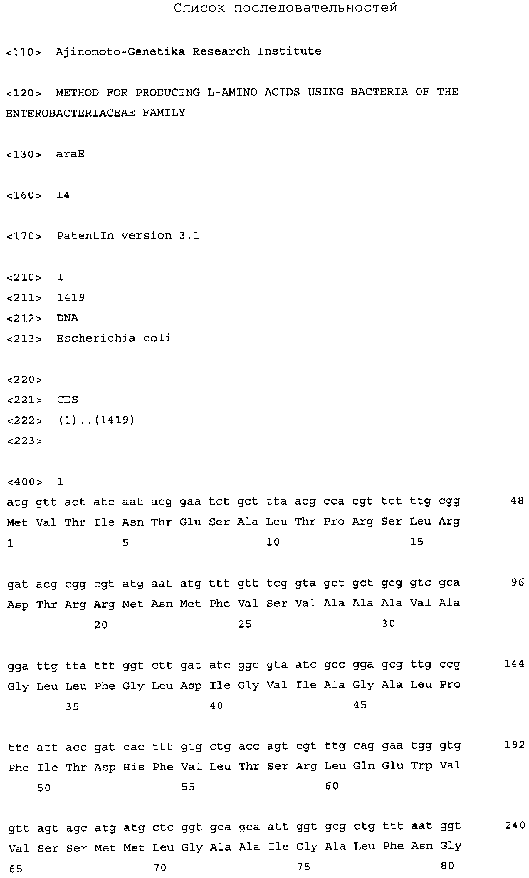 рН 7.1 в Секции А доводили с помощью NH4OH. Каждую из Секций А-Н стерилизовали отдельно. Пример 8. Эффект усиления экспрессии гена araE на продукцию глутаминовой кислоты. Для проверки эффекта влияния усиленной экспрессии гена araE под контролем РL-tac промотора на продукцию глутаминовой кислоты фрагменты ДНК из хромосомы описанного выше штамма Е.coli MG1655PL-tacaraE могут быть перенесены в хромосому штамма-продуцента глутаминовой кислоты Е.coli VL334thrC+с помощью Р1 трансдукции (Miller, J.H. (1972) Experiments in Molecular Genetics, Cold Spring Harbor Lab. Press, Plainview, NY). Штамм VL334thrC+ подробно описан в Европейской патентной заявке ЕР1172433. Оба штамма, родительский VL334thrC+ и полученный VL334thrC+ РL-tacaraE, могут выращиваться с перемешиванием при 37°С в течение 18 часов в 3 мл питательного бульона. 0.3 мл полученных культур может быть внесено в 3 мл ферментационной среды в 20×200 мм пробирок и выращивают при 37°С в течение 48 часов на роторной качалке при 250 об/мин. Состав ферментационной среды (рН 7.2) (г/л):