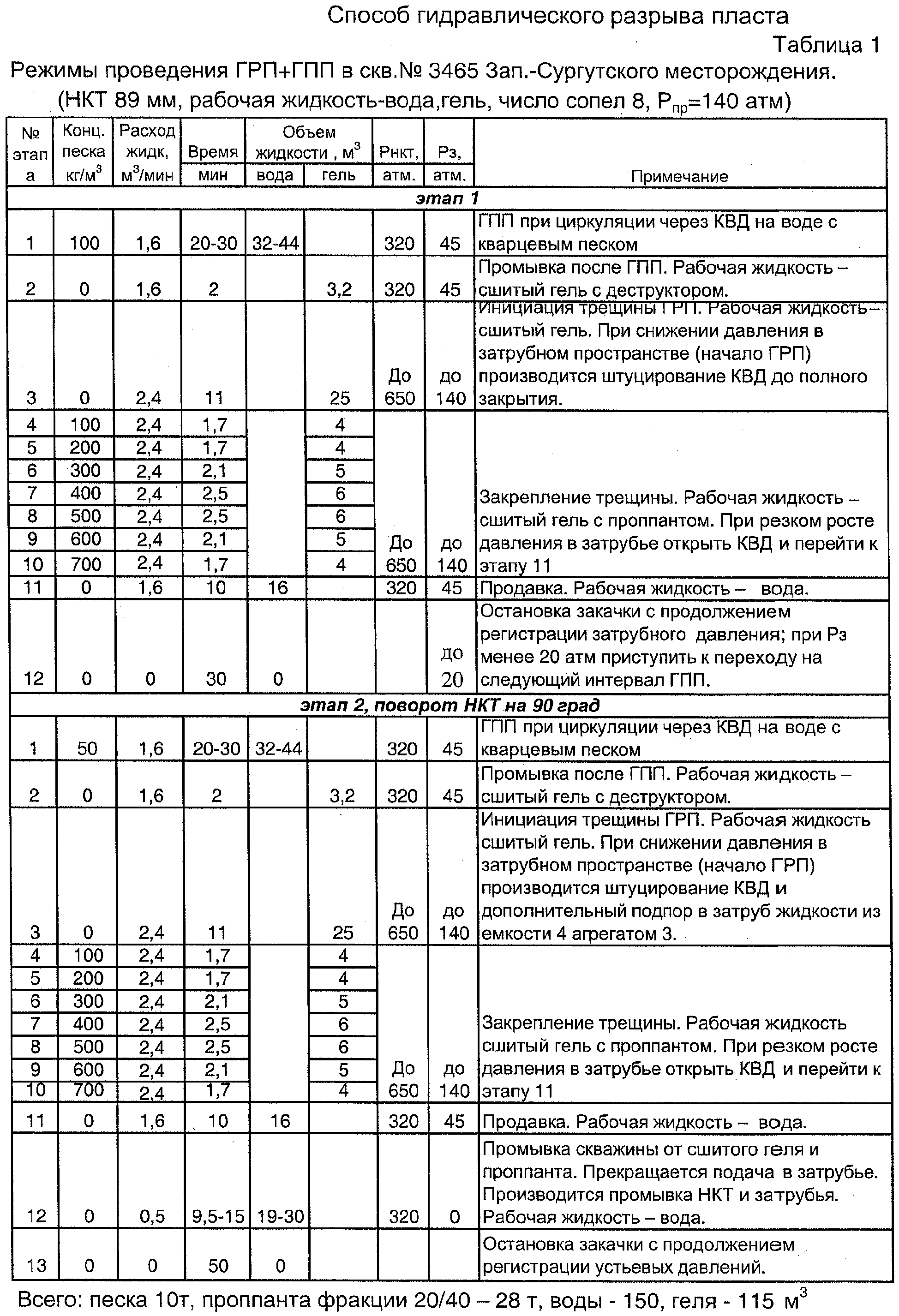 При существующих технологиях проведения ГРП в скважинах с глубинами свыше 1500 м образуется вертикальная трещина, распространяющаяся в противоположных направлениях от ствола в глубь пласта и по вертикали, ее заполнение осуществляется текучей смесью технологической жидкости и наполнителя (песок, проппант). Давление начала разрыва пласта значительно превышает предельно допустимое давление в колонне скважины, поэтому продуктивный интервал изолируется пакером, разобщающим кольцевое пространство с низким давлением и сообщающиеся НКТ и забой с высоким давлением. Создаваемая трещина проходит через продуктивные прослои и служит основным дренирующим пласт каналом.