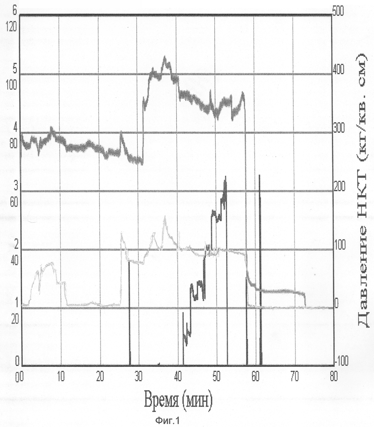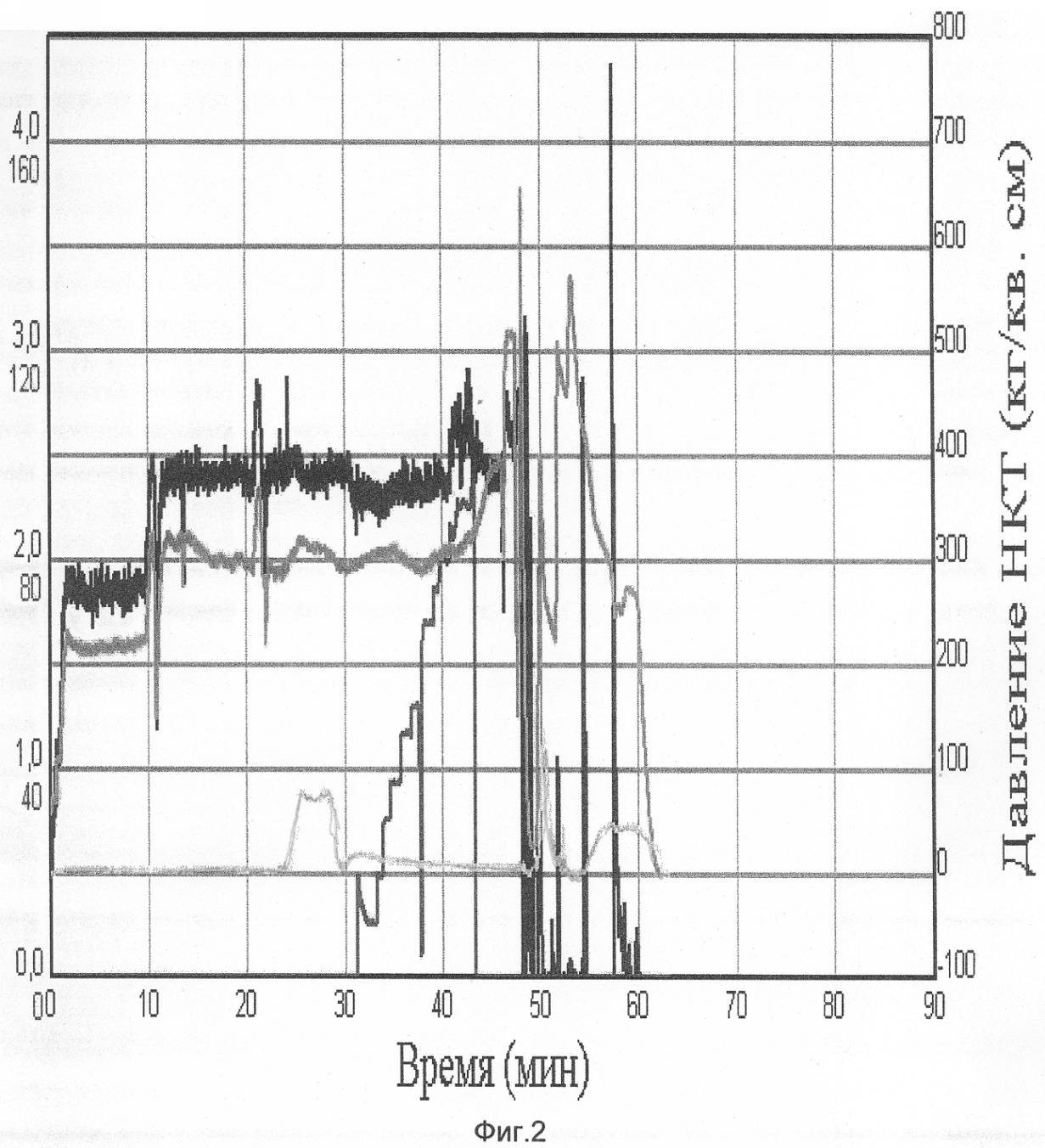 Перед вторым этапом был выполнен подъем колонны НКТ, ее поворот на 90° и установка в заданном интервале. На втором этапе ГПП проводилась при свободной циркуляции воды с песком (см. фиг.2). Вскрытие колонны ГПП отмечено на 11-ой минуте процесса, что отчетливо видно на характеристике процесса (см. фиг.2). Из характеристики видно, что поглощение воды начато с момента вскрытия обсадной колонны, отсюда следует, что ранее созданная трещина была заблокирована гелем и потери рабочей жидкости через нее были незначительны. На 20-ой минуте произведен переход на подачу геля с расходом 2.4 м3/мин, на 24-ой минуте произведено перекрытие затрубного пространства, что привело к росту затрубного давления до 75 атм (см. картограмму на фиг.2). На 28-ой минуте процесса отмечено резкое снижение давления в затрубном пространстве, произошел разрыв пласта. На 29-ой минуте с начала процесса отмечено снижение давления в затрубном пространстве и давления нагнетания, что является следствием разрыва пласта. Переход агрегата ЦА-320 на третью скорость нагнетания не привел к росту давления в затрубном пространстве, что свидетельствует об интенсивном развитии трещины и эжектировании в нее из затрубного пространства нагнетаемой жидкости, т.е. гидроперфорационные отверстия работают как струйные насосы, создавая зону разрежения в затрубном пространстве.