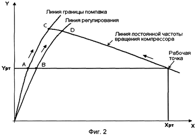 На фиг.2 показано положение рабочей точки компрессора в координатах X, Y. Здесь Хрт, Yрт являются соответственно координатами рабочей точки компрессора для частоты вращения компрессора n. Точка А, расположенная на границе помпажа, имеет ординату рабочей точки Yрт, такую же ординату имеет и точка В, расположенная на линии регулирования. При этом считается, что в текущий момент времени расстояния от рабочей точки до границы помпажа (линии регулирования) определяется положением рабочей точки относительно точек А и В, хотя фактически для линии частоты вращения n такими точками являются точки С и D. Однако при движении рабочей точки по линии постоянной частоты вращения компрессора в направлении к границе помпажа вместе с рабочей точкой перемещаются и точки А и В в направлении соответственно точек С и D. Когда рабочая точка достигает точки D, расстояние от рабочей точки до линии регулирования достигает значения задания (1) и регулятор начинает осуществлять стабилизацию режима в этой точке линии регулирования за счет открытия противопомпажного клапана. Если рабочая точка достигает точки С, то компрессор достигает границы помпажа, после чего возможен переход в зону неустойчивой работы компрессора, т.е. помпаж компрессора. Таким образом, хотя при удалении рабочей точки от границы помпажа (линии регулирования) положение точек на этих линиях для соответствующей частоты вращения компрессора не точно известно, тем не менее рабочая точка компрессора точно находит их положение.