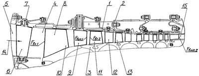 Поток воздуха 14 поступает на вход 5 компрессора 1 и выходит на выходе 15.