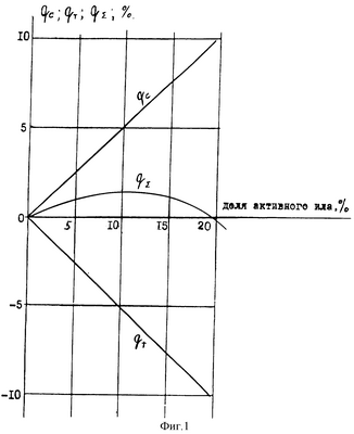 Известно, что при снижении теплоты сгорания топлива снижается температура горения и теплоотдача от факела [2]. Поэтому доля добавленного к мазуту активного ила определяется исходя из возможности увеличения степени черноты факела (при этом теплоотдача увеличивается) и с учетом одновременного снижения температуры горения (при этом теплоотдача уменьшается). Оценки с использованием формулы (4) и пирометрического коэффициента для температуры горения =0,85 дают следующий характер изменению теплоотдачи от факела (фиг.1). С увеличением доли в мазуте активного ила за счет одновременного излучения сажистых и зольных частиц активного ила теплоотдача от факела qC несколько увеличивается, однако за счет снижения температуры горения смеси теплоотдача q одновременно снижается. При этом суммарная теплоотдача q проходит через максимум в области 10-12% добавленного активного ила. Эта величина и принята в качестве максимальной доли добавленного активного ила к мазуту. Активный ил в указанных количествах может смешиваться с мазутом и без добавления масла, при этом теплоотдача от факела даже несколько увеличивается.