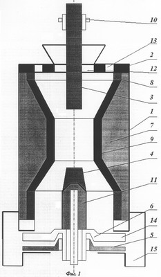 3. Устройство по любому из пп.1 и 2, отличающееся тем, что футеровка вертикального футерованного кожуха выполнена двухслойной, состоящей из рабочего огнеупорного и внешнего теплоизоляционного слоев, при этом огнеупорный слой футеровки в зоне широкой части кожуха выполнен из неэлектропроводного материала с рабочей температурой до 1800°С и твердостью не более 5,0 по шкале Мооса, а в зоне узкой части кожуха – из электропроводного материала с рабочей температурой до 2500°С и твердостью не менее 5,0 по шкале Мооса.