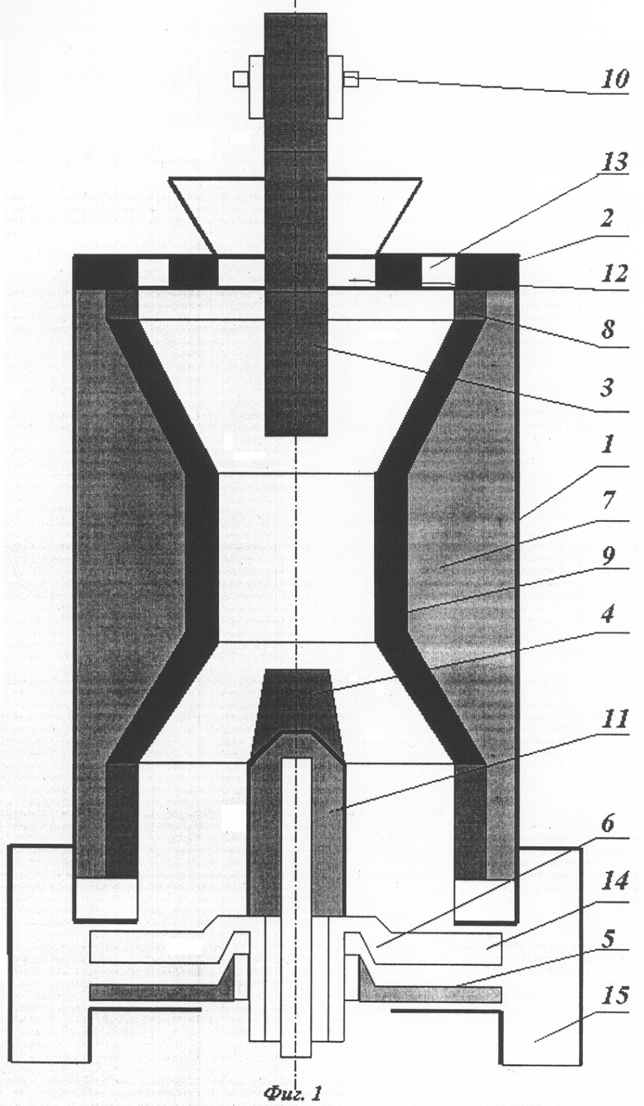 В нижней части кожуха размещен подовый диск 5, имеющий центральное отверстие для прохода фальшниппеля 11 нижнего электрода 4.