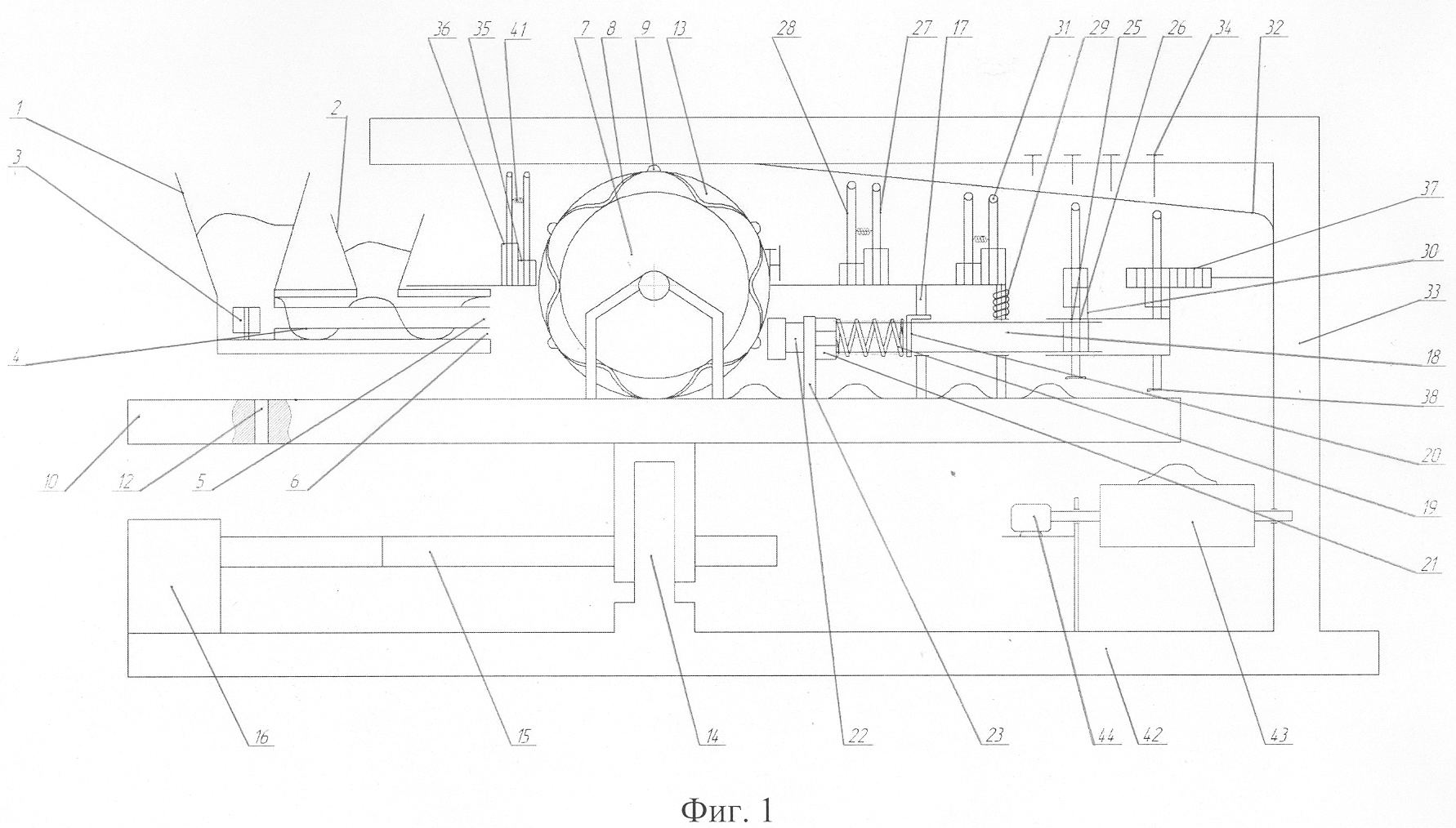 Зубчатые диски 10 и 11 (фиг.2) в нижней части посредством ступиц, насаженных на осях 14, и передачи 15 соединены с приводом 16, а в верхней части на стойках 17 с возможностью радиального перемещения на штангах 18, снабженных с одной стороны пружинами 19, регулировочными элементами 20, роликами-копирами 21, причем последние имеют возможность взаимодействия с неподвижной криволинейной пластиной 22, укрепленной на неподвижной стойке 23, снабженной винтами 24 регулировки кривизны вышеуказанной пластины 22. С другой стороны штанги 18 имеются направляющие втулки 25 и 26, в которых с возможностью вертикального перемещения и вращения установлены стержни 27 и 28 с пружинами 29, гайками 30 и роликами-копирами 31, причем последние имеют возможность взаимодействия с неподвижной криволинейной пластиной 32, закрепленной на стойке 33, имеющей регулировочные винты 34. Стержни 27 и 28 снабжены взаимно зацепленными шестернями 35 и 36 с одинаковым количеством зубьев, причем последняя имеет большую длину и возможность зацепления с зубчатой рейкой 37, закрепленной также на стойке 33. На одном конце стержней 27 и 28 закреплены лапки 38 доформования изделий 39, а на другом стержни имеют штифты-фиксаторы 40 и пружины 41. Под дисками 10 и 11 в зоне доформирования пельменей установлен на раме 42 транспортер 43 с приводом 44, причем вышеуказанная рама 42 является основанием для крепления стоек 23 и 33 пластин 22 и 32.