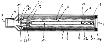 Для возможности долговременного пользования ингалятором топливный баллончик 6 и баллончик 15 для действующих веществ целесообразно выполнять сменными и в этих целях разъемно соединять их с ингалятором или же предусмотреть возможность их многократной заправки топливом, соответственно раствором действующих веществ. Для этой цели полый цилиндр можно снабдить, например, оснащенным клапаном патрубком, в который можно ввинчивать топливный баллончик 6, необязательно совместно с содержащим действующие вещества баллончиком 15.