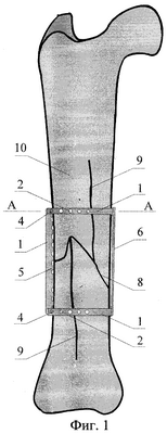 на фиг.1 – иммобилизация отломков травмированной трубчатой кости фиксатором-стяжкой (общий вид);