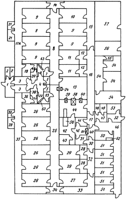 II. Предбарьерная зона («грязная»), содержащая: помещения для очистки клеток и сбора отходов 31 и 41, переходной тамбур общего коридора 40, помещение «грязной» мойки 42, помещение прачечной 43, помещение проходных передающих устройств 44 с проходными автоклавами 58и 59 и передаточным шлюзом 60, помещение необработанных отходов 45, оборудованное установкой термической обработки отходов 61, помещение общего коридора 46, помещение раздевалки для работников предбарьерной зоны 47, помещение туалета 48, помещение душа 49, помещение склада для временного хранения обработанных отходов 50 с холодильной камерой для хранения обработанных трупов животных 62, помещения складов для хранения кормов, подстилки, клеток, дезинфицирующих средств, спецодежды и других материалов 51, входной тамбур 52, помещение для приема животных 53, административные помещения 54, помещение туалета 55, помещение энергетических установок 56, помещение штатных вентиляционных установок 57.