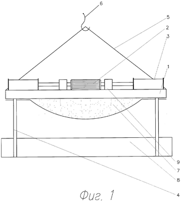 Грузозахватное устройство, подвешенное с помощью канатов 5 на крюк грузоподъемной машины 6, содержит несущую раму 1, на которой установлены электродвигатель 2, редукторы 9 с барабанами 3, на которые намотаны текстильные стропы 4, удерживающие груз 8. Под рамой расположено прижимное устройство 7 в виде эластичной подушки.