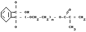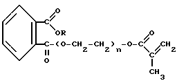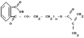 ![]() где R – ![]() – (CH2)6 – CH3, n = 2, 3, отличающийся тем, что процесс ведут при нагревании в три стадии с охлаждением после каждой путем взаимодействия фталевого ангидрида и одноатомного спирта при их эквимолярном соотношении 1 : 1, с последующей обработкой полученного моноэфира фталевой кислоты ди- или триэтиленгликолем в эквимолярном соотношении 1 : 1 в растворителе в присутствии катализатора и дальнейшей этерификацией полученного диэфира фталевой кислоты метакриловой кислотой в растворителе в присутствии ингибитора полимеризации. РИСУНКИ