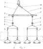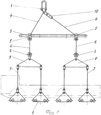 4. Грузозахватное устройство по п.1, отличающееся тем, что оно снабжено узлом регулирования расстояния между подвеской и местом соединения гибких тросов с продольной траверсой, выполненным в виде комплекта сменных проушин, имеющих узлы соединения с подвеской и гибким тросом.