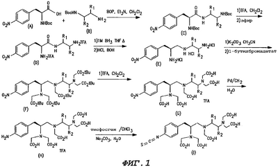 который включает (а) связывание N-трет-бутоксикарбонил-п-нитро-L-фенилаланина (А) и монозащищенного диамина (В) с образованием соединения (С); (b) удаление аминзащитных групп в (С) с образованием ТФУ-соли (D) ; (с) восстановление (D) с образованием (Е) ; (d) пентаалкилирование (Е) с образованием (F); (е) удаление аминзащитных групп в (F) с образованием соли трифторуксусной кислоты (G) ; (f) восстановление нитрогруппы в (G) с образованием соли трифторуксусной кислоты (Н) ; и (g) превращение аминогруппы в (Н) с образованием производного DTPA.