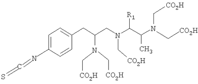 Brechbiel et al. предложили химически модифицированные хелаты EDTA и DTPA, имеющие изотиоцианатную группу, способную эффективно связываться с белками. Синтез хелатов можно суммировать как двустадийный способ , где первая стадия включает образование этилендиамина или диэтилентриамина с последующим алкилированием аминов с образованием соответствующей полиуксусной кислоты и вторая стадия включает превращение функциональной группы бензильного замещения с получением реакционноспособной части, пригодной для связывания белков.