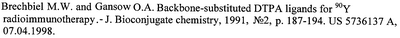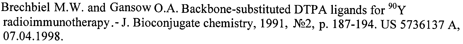 SU 535292 А, 13.12.1976. Brechbiel M.W.and Gansow O.A.”Synthesis ofC-fimctionalized trans-cyclohexyldiethylenetriaminepenta-acetic acids for labelling of monoclonal antibodies with the bismuth-212 -particle emitter”. – Journal of the chemical society, Perkin Transactions 1, №9, 07.05.1992, p.1173-1178.