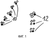 Фиг.1 схематически показывает один пример, который следует понимать только как схему, где показаны в виде отрезков: слева, линии, указывающие по диагонали вверх, и, справа, идущая вертикально линия. Показанные полностью точки 10 или 12 (слева – с первой по третью, справа – с первой по четвертую) должны быть нанесены из соответствующих чернильниц, снабженных печатной жидкостью, обогащенной флуоресцирующими наночастицами, при необходимости секретными. Эти наночастицы являются маленькими кристаллическими частицами, которые либо сами, либо с помощью дотирующих добавок при возбуждении флуоресцируют или фосфоресцируют. Отдельные точки 10, 12 могут быть напечатаны печатной жидкостью, содержащей наночастицы, выходящей из особого резервуара. Благодаря их малому размеру, от 1 до 1000 нанометров, предпочтительно в области диаметра 300 нанометров или меньше – в зависимости от диаметра сопла, не возникает опасности засорения очень узких сопел для струйной печати.