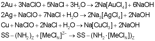 В условиях электролиза, заявляемых нами, кроме активного хлора и гипохлоритов образуется значительное количество синглетного кислорода O2*, присутствие которого ускоряет процессы окисления, способствует цепным реакциям окисления восстанавливающих примесей, находящихся в породе. Присутствие полимера способствует смещению химического равновесия в нужную сторону, создает кинетические ограничения вредного процесса цементации металла на восстанавливающих примесях в руде, а также способствует в дальнейшем полному извлечению металла из раствора, так как комплексы металла с полиэлектролитом обладают большей способностью к сорбции на сорбентах, создают дополнительную селективность процесса.