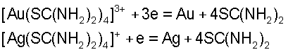 Катионные комплексы золота и серебра уже могут быть использованы для электроосаждения на катоде. Под действием электрического тока при отрицательном потенциале катода металлы выделяются на электроде в виде осадков, схема 4.