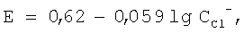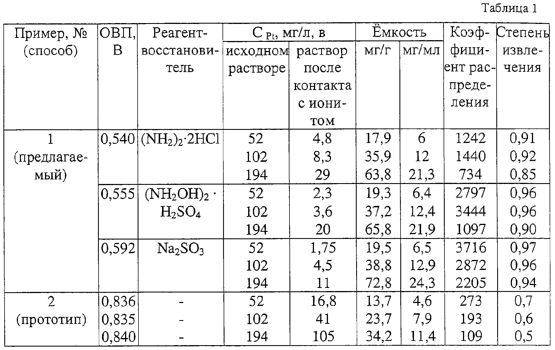 где Е – окислительно-восстановительный потенциал раствора (по отношению к водородному электроду), В; СCl – – суммарная концентрация в растворе хлорид-иона, моль/л, путем обработки его восстановителем. В ходе осуществления извлечения платины из солянокислых растворов сложного состава сорбцией платины на комплексообразующем ионите, содержащем тиомочевинные функциональные группы, доводят значение ОВП до равного или меньшего значению, определяемого предложенным уравнением, путем добавления в раствор какого-либо восстановителя, например хлорида гидразина, сульфата гидроксиламина, сульфита натрия или др. Затем обработанный раствор направляют на сорбцию платины на колонку, заполненную ионитом, содержащим тиомочевинные функциональные группы. После насыщения платиной анионит отмывают от раствора, из которого велась сорбция, подкисленной соляной кислотой водой, и десорбируют платину раствором тиомочевины, подкисленным соляной кислотой. Из полученных десорбатов, содержащих платину в концентрации несколько г/л, платина может быть выделена известным способом, например, в виде сульфида после подщелачивания десорбатов и их нагревания. Новым и существенным, неизвестным из современного уровня науки и техники в предлагаемом техническом решении является предложение предварительно доводить (снижать) ОВП раствора до значения, равного или меньшего значения, определяемого предлагаемым уравнением, путем обработки его восстановителем и лишь после этого приводить раствор в контакт с ионитом с тиомочевинными функциональными группами для сорбции платины и осуществлять последующие операции промывки насыщенного платиной ионита и десорбции платины раствором тиомочевины. Обнаружено, что при доведении ОВП растворов до значений, равных или меньших значений, определяемых предлагаемым уравнением, практически вся присутствующая в растворе платина восстанавливается и переходит в форму хлоридных комплексов платины (II). По-видимому, соединения платины (II) сорбируются на ионитах с тиомочевинные функциональными группами более избирательно, чем соединения платины (IV) {а в аффинажных и других растворах платина, в основном, находится в окисленной форме в виде соединений платины (IV)}, благодаря чему в результате предварительной обработки растворов с целью снижения их ОВП при последующем приведении растворов в контакт с ионитом достигается заметно более высокая степень насыщения сорбента платиной (или, иными словами, более высокая емкость по платине), что обеспечивает более высокую производительность способа – более высокий выход извлеченной платины с единицы объема сорбента, более высокую степень ее извлечения и более высокое концентрирование. Значения ОВП раствора, при котором практически вся платина переходит в форму соединений платины (II), зависят от суммарной концентрации в растворе хлорид-иона и определяются по предлагаемому уравнению. Доведение ОВП раствора до значений, более низких, чем те, которые следуют из уравнения, не приводит в последующем к ухудшению результатов извлечения платины. Предложение снижать ОВП растворов до предлагаемых в данном техническом решении значений перед осуществлением сорбции платины на ионите с тиомочевинными функциональными группами в патентной и другой научно-технической литературе отсут