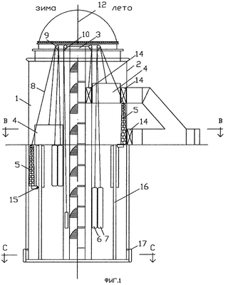 На фиг.1 и 2 показано здание 1, включающее цилиндрическое светопрозрачное покрытие 2, лестнично-лифтовую шахту 3, жилой корпус 4, теплицу 5, резервуар с холодной водой 6, резервуар с горячей водой 7, попарно связанные между собой (жилой корпус – с резервуаром горячей воды, теплица – с резервуаром холодной воды) тросами 8, переброшенными через блоки 9, поддерживаемые кронштейнами 10 (фиг.5), прикрепленными к полой цилиндрической обойме 11, надетой на верхнюю часть цилиндрической лестнично-лифтовой шахты 3, с возможностью вращения вокруг вертикальной оси 12, скользя на подшипниках 13. При этом теплица 5, перемещаясь вокруг центральной вертикальной оси 12, благодаря залповым выбросам аэрозоли и газа в вегетационных трубах увлекает за собой жилой корпус 4, связанный с теплицей 5, а резервуары с холодной и горячей водой вокруг оси 12 не перемещаются, т.к. тросы 8, которыми они прикреплены, имеют шариковый оголовок, который прокручивается вдоль круговой прорези, освобождая эти элементы от кругового вращения [1].