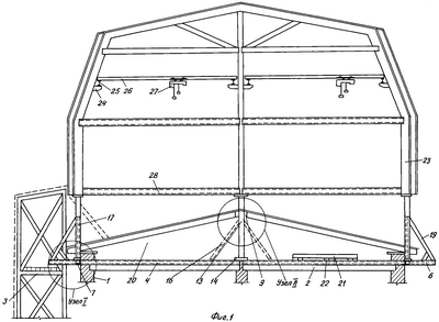 После установки стоек отверстия 9 в крыше здания заделывают, а защитные зонтики 10 снимают, после чего в чердачном помещении 20 базового здания осуществляют временную гидроизоляцию, а по поперечным балкам 4 устанавливают рабочий настил 21 на виброизолирующих амортизаторах 22.