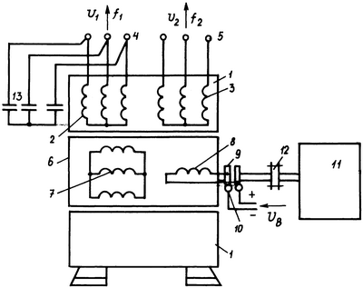 На статоре 1 генератора в общих пазах расположены обмотки 2 с числом пар полюсов p1 и 3 с числом пар полюсов p2, подключенные к выходным клеммам 4 и 5, к которым подключаются электроприемники (не показаны). На роторе 6 размещены трехфазная закороченная обмотка 7 с числом пар полюсов p1 и обмотка возбуждения 8 с числом пар полюсов р2, присоединенная к контактным кольцам 9, напряжение на эту обмотку подается через трущиеся щетки 10. Ротор 6 приводится во вращение первичным двигателем 11, валы первичного двигателя 11 и генератора соединены муфтой 12. Первичный двигатель 11 является источником механической мощности; им может быть двигатель внутреннего сгорания, ветроколесо, гидротурбина и другие известные источники механической мощности. Параллельно обмотке 2 подключен трехфазный конденсатор 13 самовозбуждения машины на частоте f1.