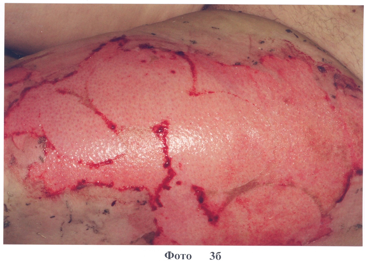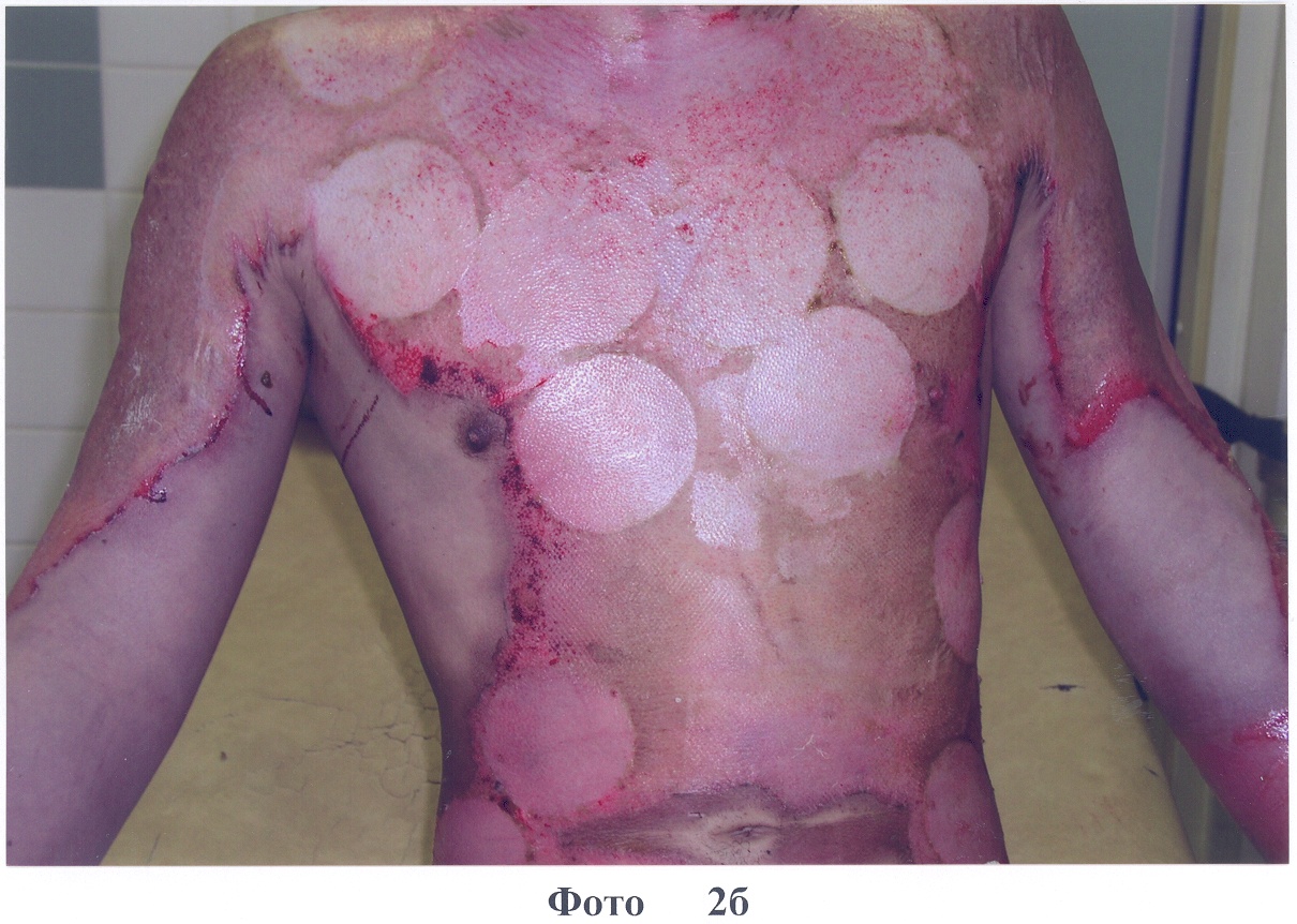 1. Больной А., 18 лет, диагноз: ожог пламенем IIIa степени 45% п.т. Доставлен через 4 часа после травмы. Наложение повязок на основе коллагена типа I с PDGF-BB через 18 часов после травмы. На 3-и сутки после наложения повязки сформировался неоэпителий по всем поверхностям (фото 2а). На 8-е сутки в областях наложения биологических повязок наблюдалась безрубцовая эпителизация всех поверхностей ожоговых ран, формирование зрелого эпителия (фото 2б). Больной выписан в удовлетворительном состоянии.
