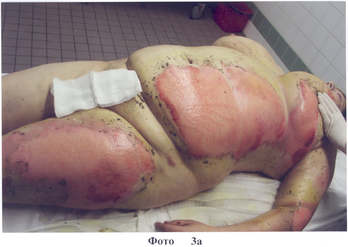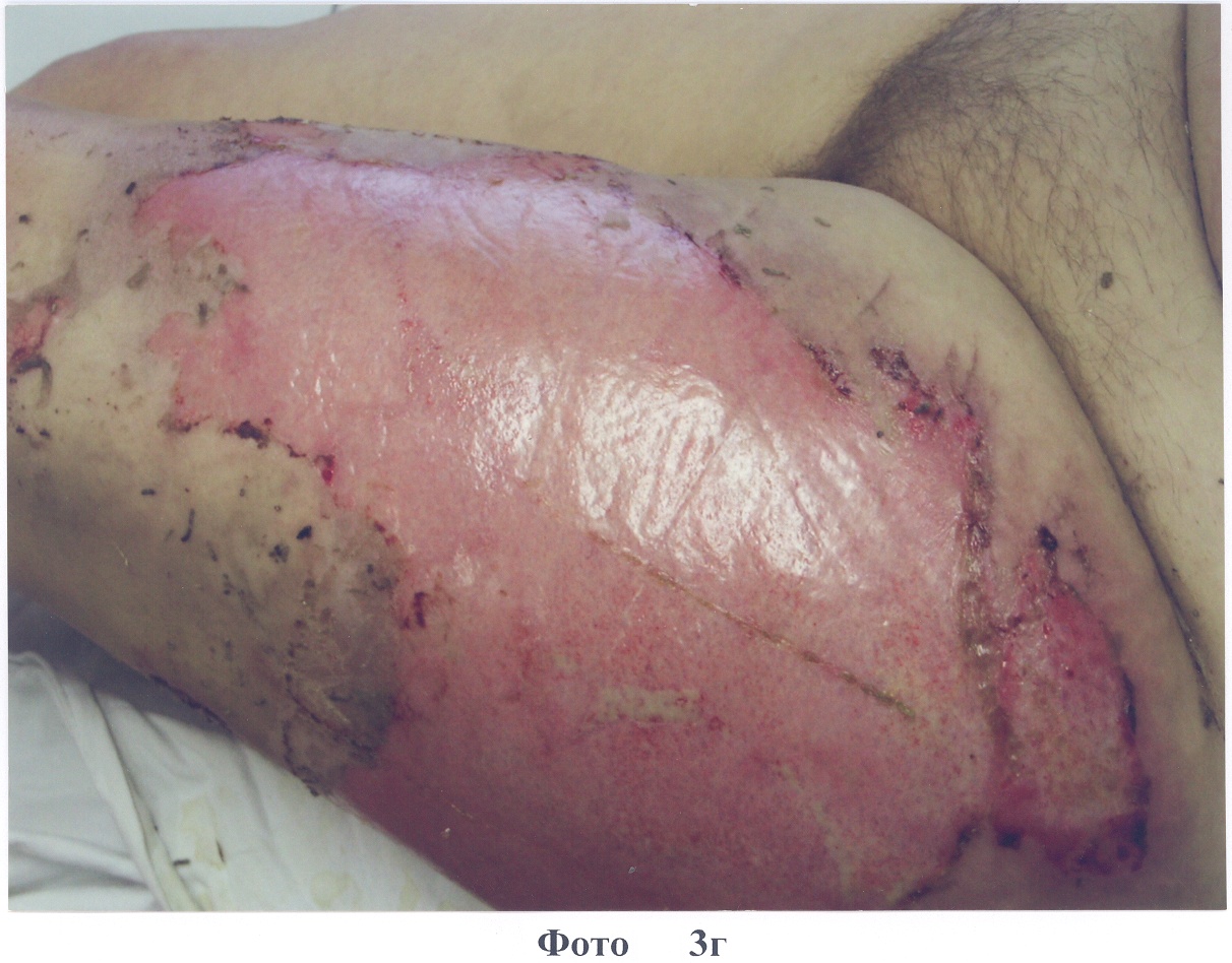 2. Больная О., 37 лет, диагноз: ожог кипятком IIIa степени 20% п.т. Доставлена через 2 часа после травмы. На следующий день наложены повязки на основе коллагена типа I с PDGF-BB (фото 3а). На 3-и сутки отмечено формирование неоэпителия по всей поверхности ожоговых ран (фото 3б). На 5-е сутки после травмы в областях наложения повязок с коллагеном наблюдается по всей поверхности ран эпителизация (фото.3 в, г). На 9 сутки после травмы отмечено заживление всех ран, без формирования гипертрофированного рубца (см. фото 3д). Больная выписана в удовлетворительном состоянии.