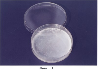 Предложенную повязку готовят следующим образом: коллаген типа I наносят тонким слоем на полимерную пленку и лиофилизируют. Приготовленную таким образом повязку герметично упаковывают, стерилизуют -лучами (2,5 кГр) и хранят при комнатной температуре. На фото №1 представлен внешний вид повязки.