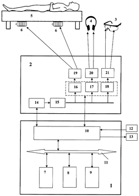 Устройство включает: компьютерный блок управления 1, блок формирования сигналов 2, очки с излучателями 3, стереотелефоны 4, виброкушетка 5 с трансдьюссерами 6.