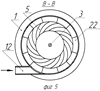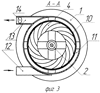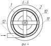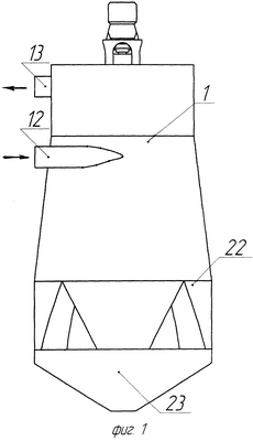 Центробежный сепаратор состоит из неподвижного корпуса 1, верхняя часть которого представляет собой кожух центробежного вентилятора, а нижняя – кожух сепаратора, в корпусе на приводных валах 2 и 3 установлены центробежные вентиляторы 4 и 5. Центробежные вентиляторы 4 и 5 в торцевых стенках 6, 7 имеют отверстия 8, 9, через которые вентиляторы 4 и 5 соединены между собой внутреннем пространством с помощью неподвижной трубы 10. Внутренний диаметр трубы 10 немного больше диаметров вентиляторов 4 и 5, и эти вентиляторы частично входят в трубу 10: вентилятор 4 нижней частью, вентилятор 5 верхней. Корпус газоочистительного сепаратора разделен на две секции с помощью диафрагмы 11, которая устанавливается выше тангенциально установленного патрубка ввода запыленного газа 12 и ниже тангенциально установленного патрубка для отвода очищенного газа 13. Диафрагма 11 выполнена в форме воронки, которая сверху вниз сужается, немного не доходя боковой поверхности центробежного вентилятора 5, затем к низу расширяется, внутри патрубка 13 установлена дроссельная заслонка 14. На внешней стороне торцевых стенок 15 и 16, на оси вращения вентиляторов 4 и 5, жестко установлены дополнительные вентиляторы 17 и 18. Снизу к торцевой стенке 16 прикреплена юбка 19. В корпусе 1, в отверстиях для приводных валов, установлены патрубки 20 и 21, диаметр которых меньше внутреннего диаметра вентиляторов 17 и 18 и которые входят внутрь вентиляторов 17 и 18. К корпусу снизу, по периметру, прикреплены карманы 22 для сбора пыли, соединенные с бункером 23, служащим для накопления пыли.