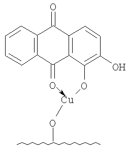 Пример 2. Для получения ализарината меди полученную основу с привитым хлоридом цинка помещают в круглодонную колбу, добавляют 150 мл насыщенного этанольного раствора ализарина. Затем вносят в колбу 0,2-0,5 г ацетата натрия до слабокислой среды рН 5-6 и нагревают с обратным холодильником в течение 20-30 минут. Полученный продукт отфильтровывают и высушивают при пониженном давлении и температуре 40°С в роторном испарителе. Допускается высушивание в потоке воздуха или инертного газа при температуре около 180°С, поскольку температура разложения комплекса ализарината меди на поверхности силикагеля составляет 191°С. Сорбенты на основе других переходных металлов получают аналогично. Полученный сорбент ализарината меди имеет следующую структуру: