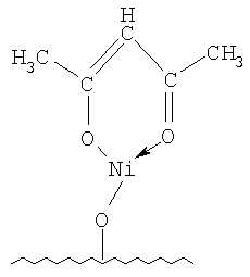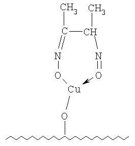 Пример 3. Для получения диметилглиоксиматов меди полученную основу с привитым хлоридом меди помещают в круглодонную колбу, добавляют 150 мл насыщенного этанольного раствора диметилглиоксима (8-оксихинолина). Затем вносят в колбу 0,5 мл соляной кислоты и нагревают с обратным холодильником в течение 20-30 минут. Полученный продукт отфильтровывают и высушивают при пониженном давлении и температуре 40°С в роторном испарителе. Допускается высушивание в потоке воздуха или инертного газа при температуре около 180°С, поскольку температура начала разложения комплекса диметилглиоксимата меди на поверхности силикагеля составляет 202°С. Сорбенты на основе других переходных металлов получают аналогично. Полученный сорбент диметилглиоксимата меди имеет следующую структуру:
