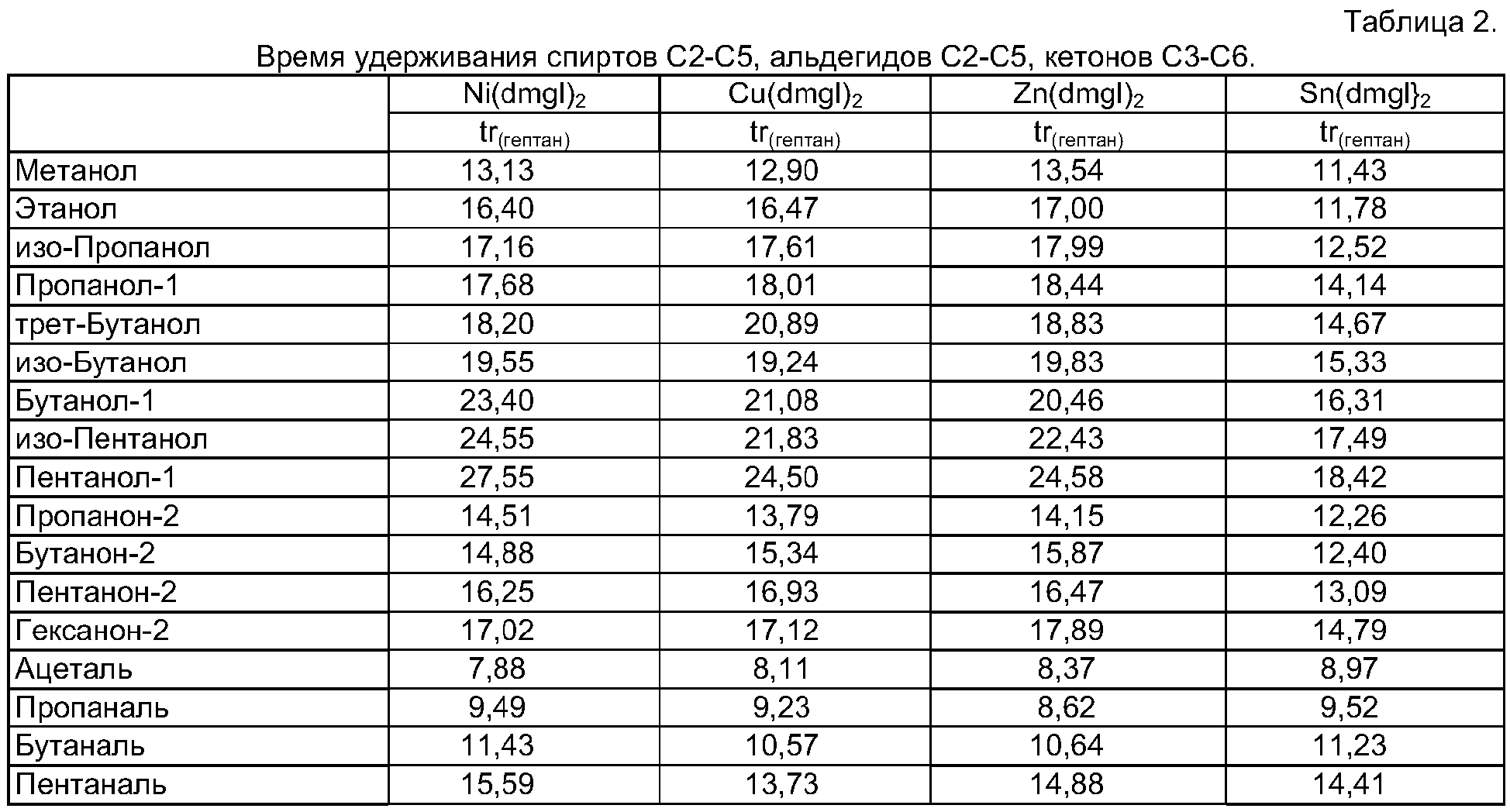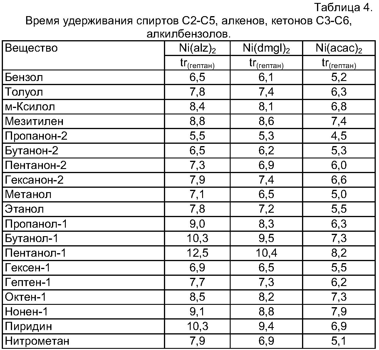 Выбор минеральных сорбентов в качестве объектов модифицирования обусловлен рядом их преимуществ перед органополимерными, в числе которых устойчивость к механическим, химическим и термическим воздействиям. Для создания сорбентов, содержащих бидентатные комплексы металлов, используют минеральные носители Силипор 075 и Хроматон N (0,200-0,250 мм, CEMAPOL Praha, Czechoslovakia). Хроматон N относится к классу диатомитовых носителей, термостабильность которых достаточно высока и находится в диапазоне 350-1000°С. Использование Хроматона N, обладающего слаборазвитой поверхностью (1 м2/г), позволяет свести к минимуму физическую адсорбцию. Силипор 075 относится к широко распространенным силикагелям. Большая удельная поверхность 75-105 м2/г позволяет получать сорбенты с большой сорбционной емкостью. Свежеприготовленный сорбент засыпают в стеклянные хроматографические колонки и подвергают кондиционированию в потоке инертного газа-носителя гелия со скоростью 5 см3/мин не менее четырех часов, повышая температуру от 50 до 150°С. Такой режим позволяет освободить поры сорбента от остатков растворителя и сорбированной влаги. В таблице 1 приведены результаты по разделению алифатических и ароматических углеводородов, изомерных спиртов С2-С5, альдегидов С2-С5, кетонов С3-С6 на адсорбционных слоях ацетилацетонатов меди, никеля, цинка, железа, нанесенных на носитель Силипор 075. Разделение осуществляли на хроматографе Chrom 5 с пламенно-ионизационным детектором и стеклянными колонками 1,2 м×3 мм ID. В таблице 2 приведены результаты по разделению изомерных спиртов С2-С5, альдегидов С2-С5, кетонов С3-С6 и метиловых эфиров карбоновых кислот С2-С4 на адсорбционных слоях диметилглиоксиматов никеля, меди, цинка и олова, нанесенных на носитель Силипор 075. Разделение осуществляли на хроматографе Chrom 5 с пламенно-ионизационным детектором и стеклянными колонками 1,2 м×3 мм ID. В таблице 3 приведены результаты по разделению смесей фенолов, спиртов С2-С5 и алкилбензолов на адсорбционных слоях ализаринатов никеля, цинка, алюминия и меди, нанесенных на носитель Силипор 075. Работа проведена на хроматографе Chrom 5 с пламенно-ионизационным детектором и стеклянными колонками 1,2 м×3 мм. В таблице 4 приведены результаты по разделению смесей изомерных спиртов С2-С5, альдегидов С2-С5, кетонов С3-С6, фенолов на адсорбционных слоях ализарината, диметилглиоксимата и ацетилацетоната никеля, нанесенных на носитель Хроматон N. Разделение проводили на газовом хроматографе “Хром-5” с пламенно-ионизационным детектором, стеклянными колонками 1,2 м×3 мм. Из полученных результатов видно, что подобранны предпочтительные условия для заявляемого способа получения композитного сорбента и композитный сорбент показывает более селективное разделение и степень сорбционного концентрирования широкого круга органических веществ с их последующим хроматографическим определением.
