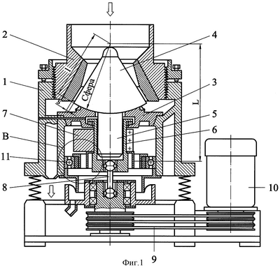 При вращении двигателя 10 крутящий момент передается дебалансу 7 через клиноременную передачу 9 и промежуточный вал 8. Дебаланс 7 развивает центробежную силу, заставляющую внутренний конус 4 совершать гирационные колебания на своей сферической опоре 3. При этом материал, загружаемый в дробилку, дробится между конусами 2 и 4. Разгрузочный зазор s между конусами имеет конструктивное ограничение своей величины, превышение которого может привести к столкновению дебаланса 7 с корпусом 1, что вызывает поломку механизма. В процессе обкатки внутреннего конуса 4 по слою дробимого материала идет износ броней конусов и соответственно растет слой материала и разгрузочный зазор s. Если величина s превысила допустимое значение, а материал в дробилку перестал подаваться, то ось внутреннего конуса 4 отклоняется от оси дробилки так, что ответное кольцо 15 касается контактного кольца 14, резина 13 демпфирует силу внутреннего конуса, подшипник 11 получает вращение и далее конус не отклоняется. Тем самым, конуса 2 и 4 не входят в соприкосновение и аварии не происходит.