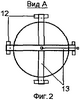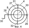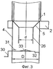 В патрубках 4, имеющих внешний диаметр D (фиг.3, 4) и соединенных с бункерами для сбора пыли 9, могут быть расположены цилиндроконические гильзы, состоящие из конических 5 и цилиндрических 26, соосно которым в каждом из патрубков 4 закреплены круглые отражающие шайбы 27. Каждая из шайб закреплена с возможностью поворота вокруг оси, перпендикулярной соответствующей оси патрубков 4. Для протекания процесса пылеулавливания в оптимальном гидродинамическом режиме между внешними поверхностями шайбы и патрубка предусмотрен зазор «s», величина которого находится в оптимальном интервале в зависимости от внешнего диаметра D патрубков 4: «s» 0,05…0,1 D. Каждая из шайб 27 расположена в опорах скольжения 28 и 29, выполненных в стенках патрубков 4. Привод поворота шайбы на 90° может быть ручным, осуществляемым от рукоятки 30, либо автоматическим от серводвигателя (на чертеже не показано). Для удержания шайбы 27 в исходном состоянии, перпендикулярном оси патрубка 4, используются по меньшей мере два упора 31 и 32, оппозитно закрепленные в стенке патрубка на оси, перпендикулярной оси привода. На поверхности шайбы 27 со стороны фильтрующего элемента может быть закреплен конический обтекатель 33 для более эффективного ссыпания пыли в бункер 9 при работе аппарата.