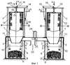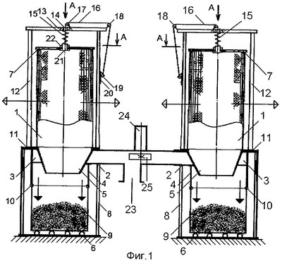 Это достигается в сдвоенном пылеулавливающем аппарате с объемным фильтрующим элементом, содержащем два фильтрующих элемента объемного типа, например, в виде фильтровальных мешков, закрепленных своими открытыми торцами на корпусе сдвоенного циклонного элемента с завихрителями улиточного типа и патрубками, внутри каждого из патрубков размещены конические гильзы, обращенные своим меньшим диаметром в сторону основания, а на корпусе сдвоенного циклонного элемента расположен электродвигатель, связанный с рабочим колесом, а фильтрующие элементы снабжены устройствами регенерации.