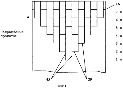 Затем включают привод клетей 1-7 (редуктор 11, электродвигатель 12, шестерня 13) и задают полосу в клеть 1, где профилируют центральную часть полосы. Профилирующими роликами 16, 17 профилируют два продольных гофра 45, а между ними пуансонами 22 профилируют периодические поперечные гофры 29. При этом центральные калибрующие ролики 20, 21 заглаживают плоские участки между продольными и поперечными гофрами, а боковые калибрующие ролики 18, 19 заглаживают плоские участки по обеим сторонам от спрофилированного рельефа.