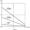 Выигрыш в данном случае определяется двумя моментами. Во-первых, тепловложение при создании предварительного выгиба « » меньше, чем при правке грибовидности той же величины (см. фиг.5). На фиг.5 приведены зависимости коэффициента «K» от скорости перемещения горелки по элементу для создания деформаций грибовидности. После нагрева опытного элемента измерялась величина угловой деформации « ». Нагрев производился для разных сталей и толщин листа. Коэффициент «K» показывает соотношение угловых деформаций свободного листа и листа с приваренной стенкой (т.е. тавра). Для получения «K» была проведена серия парных нагревов для одной и той же скорости движения горелки (свободный лист и тавр). Мощность горелки принималась равной примерно 3200 кал/сек (т.е. обычно применяющейся для этих целей). Из графиков на фиг.5 видно, что в свободном листе угловую деформацию « » до двух раз получить легче, чем в тавре. Во-вторых, тепловложение для предварительного выгиба используется одновременно и для предварительного подогрева (т.е. не вкладывается дважды).