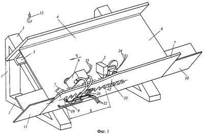 На фиг.1 приведены также следующие обозначения: позицией 22 обозначены газовые шланги для горелки нагревателя 9, позициями 23 и 24 – подводящие электропровода соответственно для нагревательного 8 и для сварочного 5 устройств, позицией 25 – траектория движения сопла газовой горелки, буквой «S» обозначено расстояние между нагревательным 8 и сварочным 5 устройствами, буквой «V» – скорость движения нагревательного устройства 8, буквой « » – угловые деформации пояса балки после прохода механизированного нагревательного устройства, буквой «b» – ширина полосы нагрева при траектории 25 движения сопла горелки.